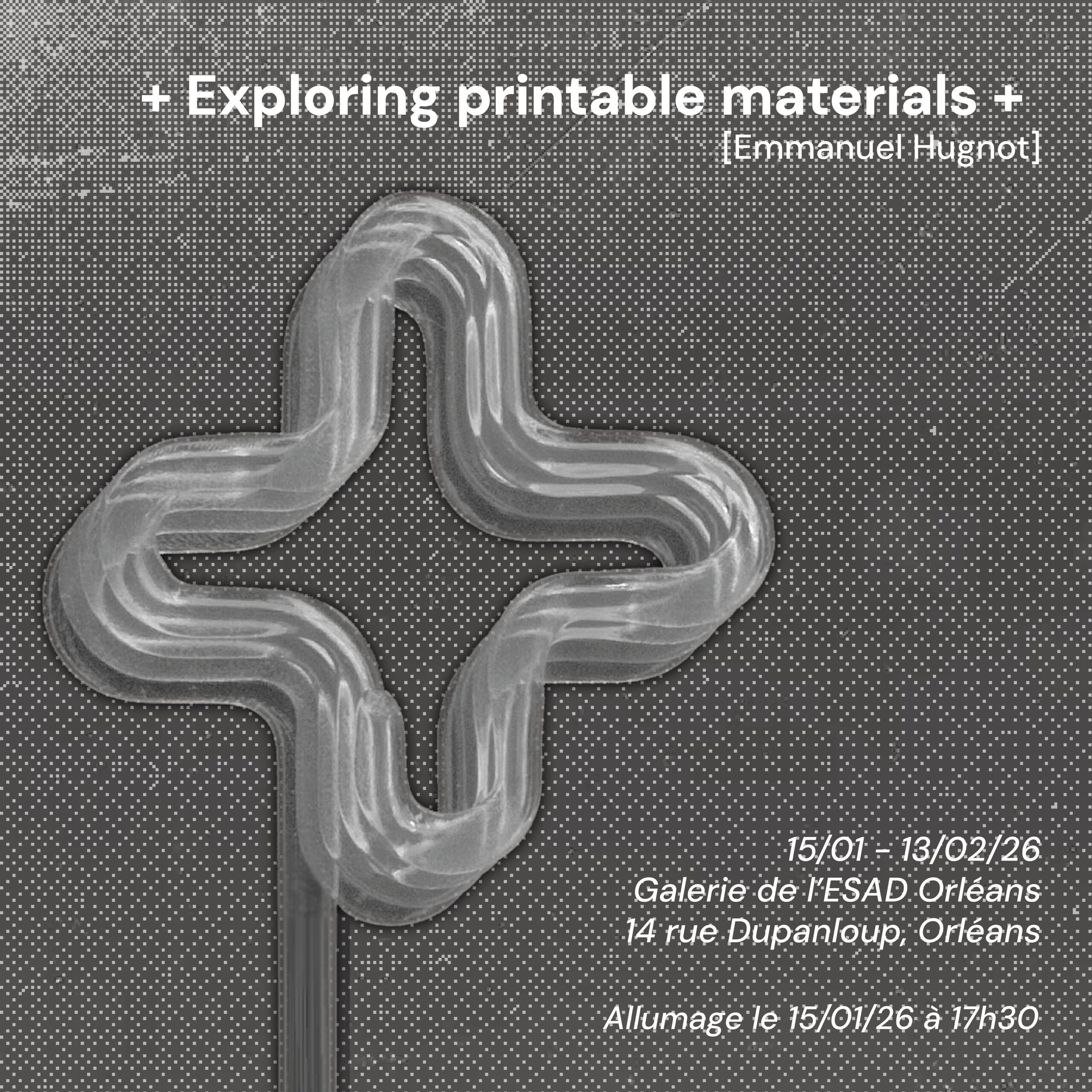 + Exploring printable materials, une exposition d’Emmanuel Hugnot, dans le cadre de sa soutenance de DSRD (Diplôme Supérieur de Recherche en Design). Il y présente ses travaux de fin de parcours en tant qu’étudiant-chercheur au sein du programme de recherche en art et design Objects Crafts and Computation de l’ESAD Orléans.